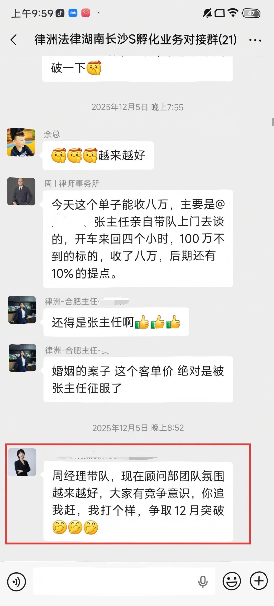 入职律洲后,首月个人业绩即达10W+。成功孵化2家合作律所,为合作律所在区域内具备核心竞争力,获得律所主任、合伙人一致好评。熟练掌握各类案件的电邀及面谈技巧,团队整体邀约率突破20%,签单率8%以上,投产比达到600%以上。擅长搭建团队,管理能力卓越,能够快速培养新人,赋能团队。