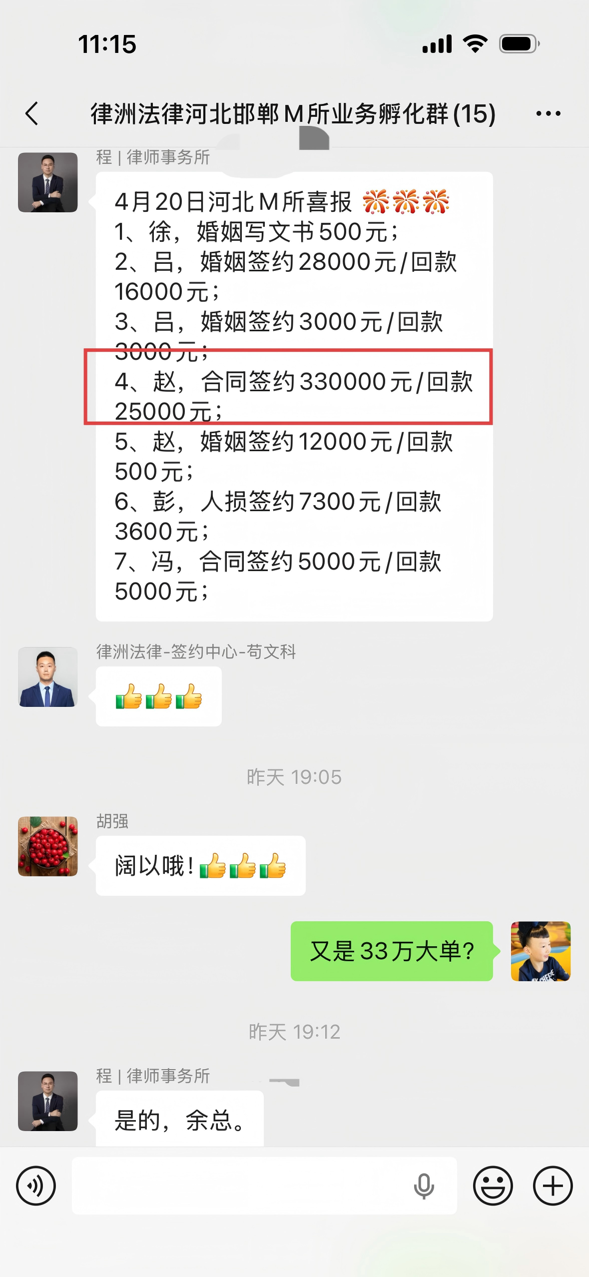 入职律洲后个人业绩15万以上,在合同纠纷、刑事案件、工伤人损方面经验丰富、业绩斐然
