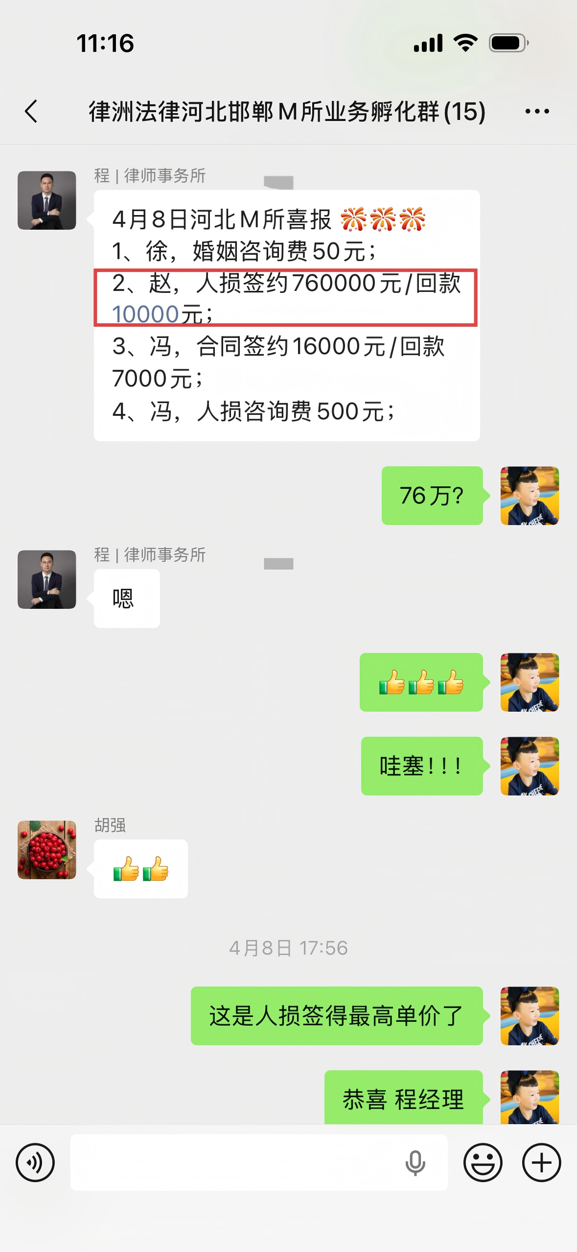 入职律洲后,个人业绩10万以上,控场能力较强,能够很好的处理客诉问题,针对工伤类、人损类纠纷处理得心应手